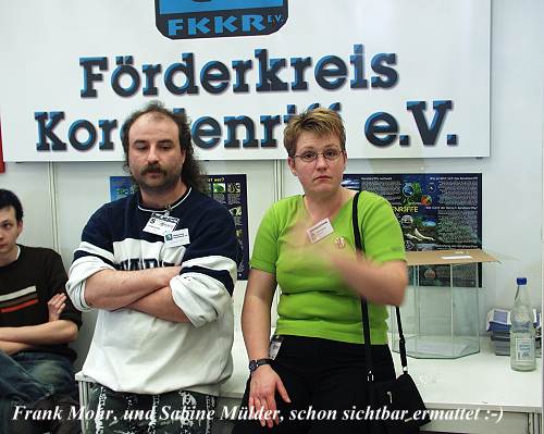 Bereits am Freitag halfen Stefan Ott, Bernd Quirbach und Frank Mohr beim Aufbau und der Einrichtung des Messestandes mit. Bernd Quirbach, seines Zeichens auch Kassierer des Vereines Förderkreis Korallenriff e.V. hatte uns zwei Rechner zur Verfügung gestellt, so das wir am Stand eine Verbindung ins Internet hatten. Manuela hatte sich auch einiges an Dekomaterial einfallen lassen [Inforahmen zum Förderkreis Korallenriff e.V. und zum Meerwasserforum.com in rot gerahmt auf den Tischen - Collage oben, hinter Frank Mohr - Poster -Fleyeraufsteller im Vordergrund des Fotos, ...] So war der Stand auch schnell reich verziert und bot den Besuchern viele Infos.![]()