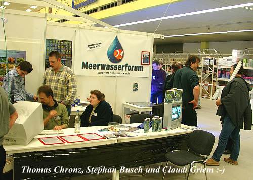 Manchmal mußte der PC dazu überredet werden, wieder online zu gehen...Für alle beteiligten war ein Auftritt mit einem Stand auf einer Messe eine wahrlich neue Erfahrung. Die Idee kam Manuela und mir nach dem Messebesuch in Duisburg. Dort war ein Meerwasserverein vertreten, der die interessierten Aquarianer so gut mit Informationen versorgte, das wir uns dachten, das können wir auch :-)