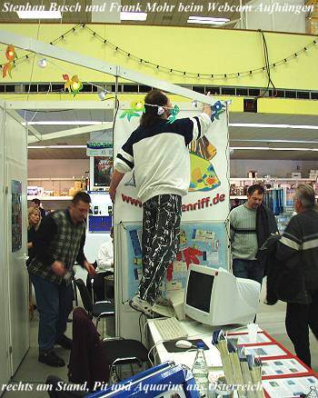 Die Webcam wird installiert!Es ist schon ein merkwürdiges Gefühl, wenn man nach den vielen Jahren vor dem eigenen Messebanner steht und sieht das eigene Logo in Übergrösse :-) Sehr gut kamen, wie uns viele Besucher bescheinigten, die Messe-Flyer an. Es wurden knapp 1000 Stück davon unter die Leute gebracht.